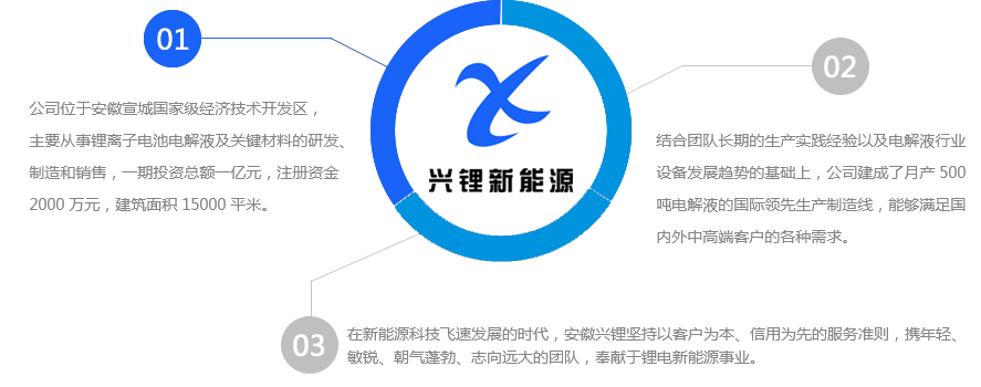 興鋰新能源,是一家專業從事鋰離子電池電解液及相關材料的研發、生產、銷售與服務的高新技術企業,目前擁有安徽宣城和貴州凱里兩個生產基地。公司主要生產鋰離子電池電解液,產品被廣泛應用于電動汽車、電動自行車、電動工具、儲能、3C數碼電子等各個領域。公司目前正在研究開發的項目包括匹配高鎳正極的電解液、匹配硅碳負極的電解液和固態電解質。憑借技術和成本優勢、良好的品質以及售后服務,在廣大客戶中贏得良好的口碑。公司團隊具有十余年專業從事鋰電材料研究開發、工藝優化、營銷服務的經驗,具有豐富的一線生產、工程設備管理經驗,具有過硬的質量保證與問題解決能力,具有創新的服務意識。先進的管理理念,精良的工藝裝備,高素質的員工隊伍,較高的生產效率,較低的生產成本,把客戶的需求落實到生產流程的每一個環節。公司高度重視科技創新...
